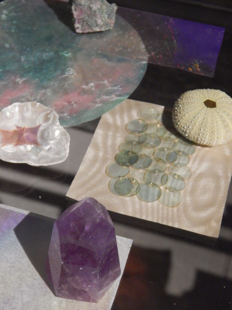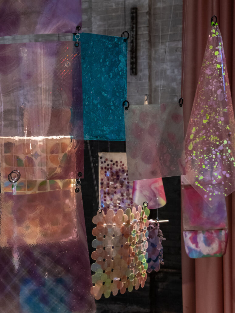 Die Arbeit kombiniert Experimente mit biobasierten Materialien mit traditionellen Handwerkstechniken und nutzt praktische Verfahren, um über die typischerweise mit nachhaltigem Design verbundene Bildsprache hinauszugehen. Effekte wie Farbverschiebungen, Moiré-Muster und mehrschichtige Texturen werden nicht als Dekoration, sondern als inhärente Materialausdrucksformen untersucht, die von Naturphänomenen inspiriert sind. Während in früheren Phasen des Projekts die Verbindungen zwischen physischen Materialien und digitalen oder immersiven Umgebungen untersucht wurden, überprüfen die Designer derzeit, wie und ob diese Komponenten in zukünftigen Iterationen weitergeführt werden sollen.